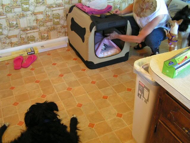 Angus laying right outside Lizzie's pen while she is asleep under her pillowcase. For those of you that don't know, Lizzie has never tolerated other dogs and she terrorizes Brogan. We decided to try seeing what would happen if they all stayed together (Brogan, Angus, Lizzie and Bunny) when my mom rode with us down to Jacksonville. Lizzie was surprisingly calm, especially with Angus. She still kept Brogan on the run, though...Baby steps.