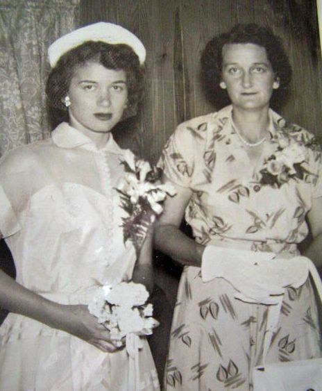 Grandmama Morton at her wedding with her mother, Hazel Thompson Britt. My grandmother told me that the dress was a light aqua and not white.